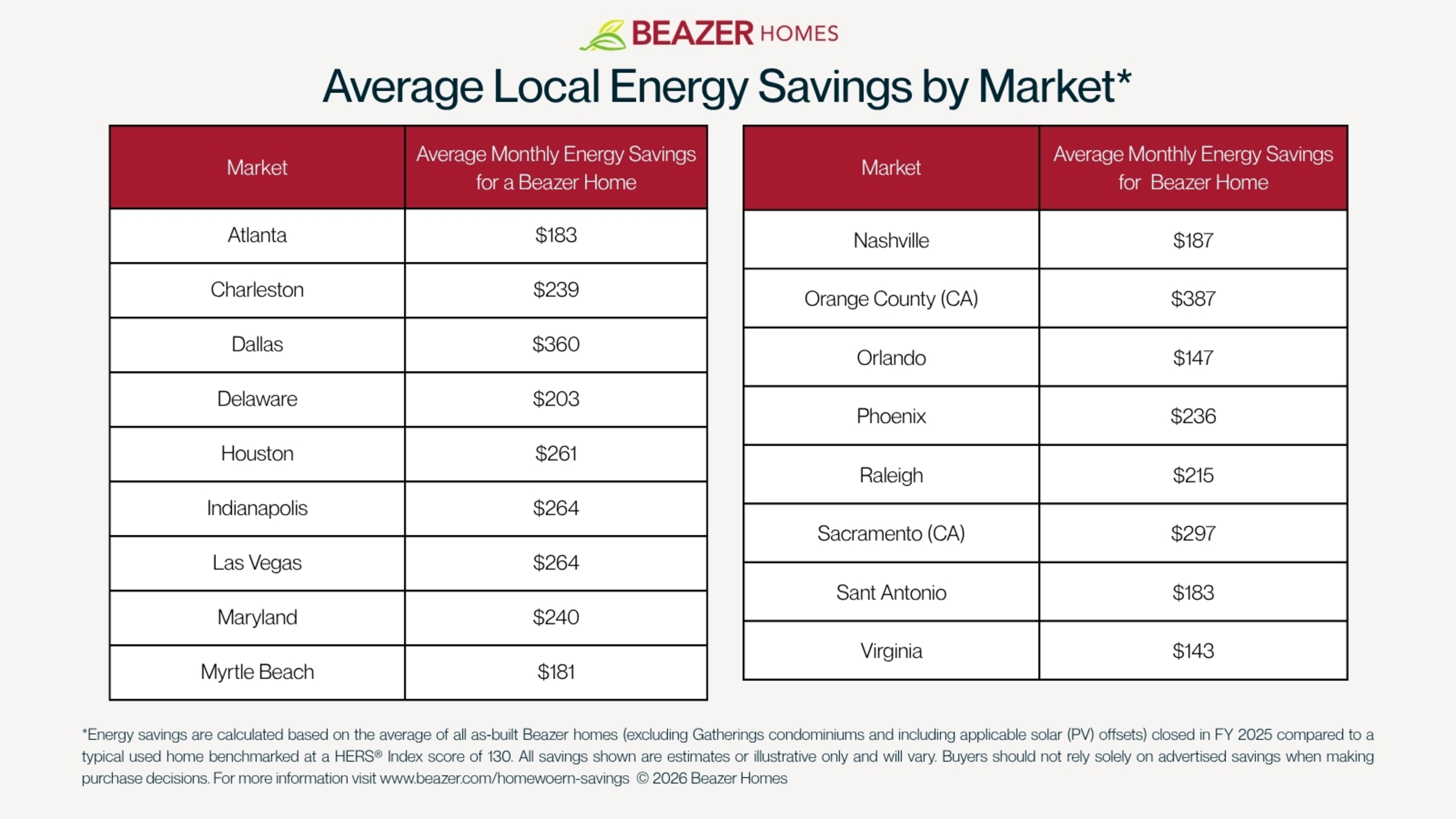 Potential energy savings are for illustrative purposes only and are calculated based on the average of as‑built Beazer homes closed in FY 2025 (excluding Gatherings condos) compared to a typical used home (HERS® Index 130) and reflect modeled solar benefits where applicable but do not include the cost to purchase or lease solar; actual results will vary. The HERS® Index is a registered trademark of RESNET® based on the ANSI/RESNET/ICC 301 Standard. Actual energy use, utility costs, HERS scores, and savings depend on home features, location, utility rates, solar availability, and homeowner behavior and are not warranted or guaranteed. Buyers should not rely solely on advertised savings when making a purchase decision. © 2026 Beazer Homes.